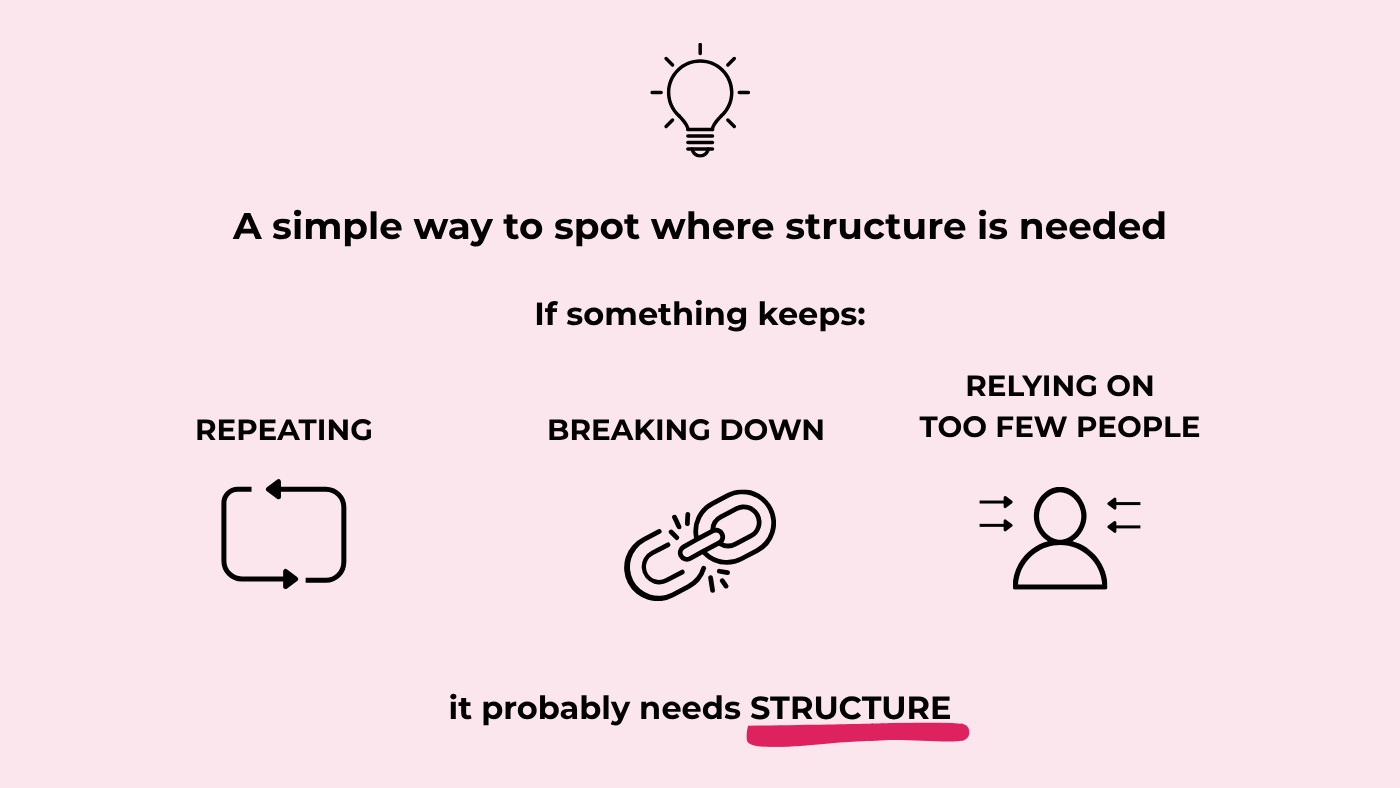 When you start thinking about structure this way, you approach it differently. You stop aiming for perfection, because it’s neither realistic nor necessary. You stop trying to organise everything or prepare for every possible scenario. And you stop adding more for the sake of it. Instead, you become more selective and focus on the areas where lack of clarity is felt most in your day-to-day operations.